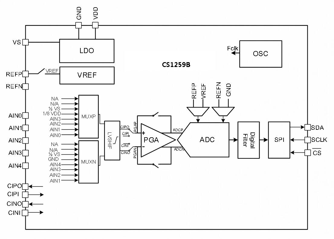 CS1259B是一顆24位高精度ADC,集成高精度ADC信號鏈、低漂移LDO、低溫漂基準(zhǔn)電壓、高精度振蕩器和3線通信接口。其中,ADC信號鏈包括:輸入MUXP/MUXN、電平移位模塊(LVSHIFT)、低噪聲可編程增益放大器(PGA)、24位Sigma-delta ADC、數(shù)字濾波器,支持橋式傳感器、紅外熱電堆等傳感器,非常適合目前熱門的額溫槍應(yīng)用。